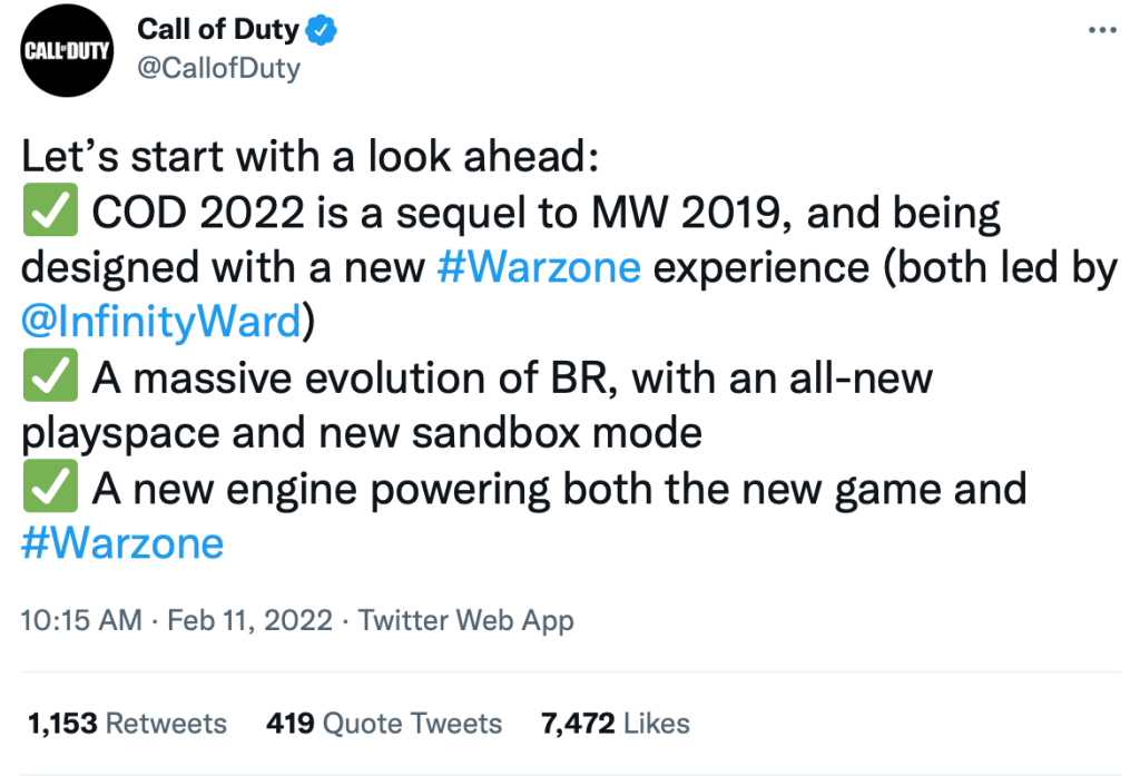 The announcement came on Feb. 11 via Activision’s Twitter page.